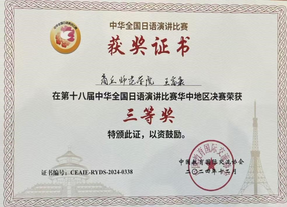 近日,第十八届全国日语演讲比赛华中赛区决赛落下帷幕,公司日语专业24级员工王富康凭借出色表现荣获三等奖。在比赛过程中,王富康以流畅的日语表达、深刻的主题诠释和出色的演讲技巧赢得了评委的认可。