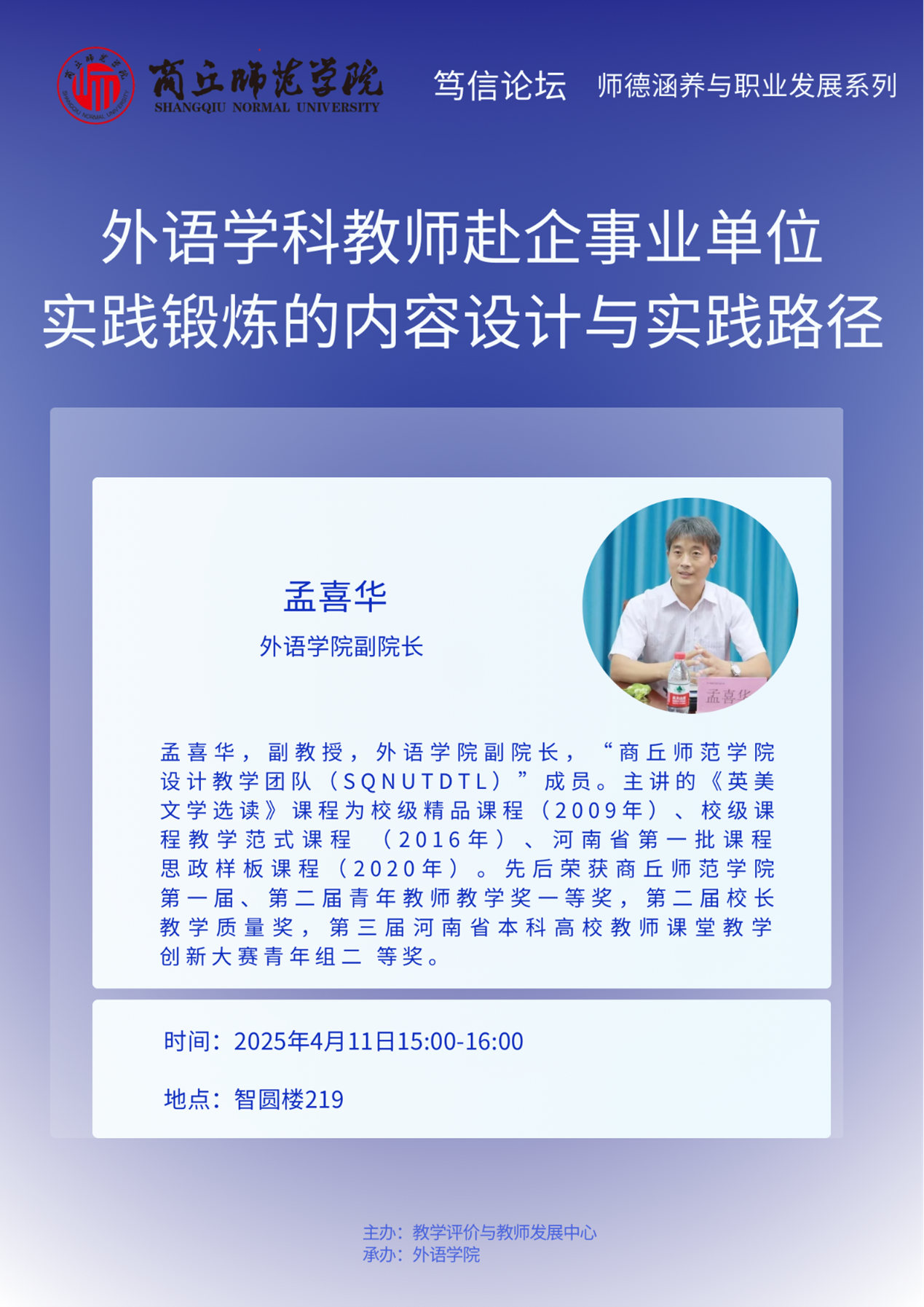 4月11日,由公司教学评价与教师发展中心主办、E8官网登录入口承办的“笃信论坛”在公司梁园校区智圆楼219多功能报告厅举行,E8官网登录入口副经理孟喜华作了题为《外语学科教师赴企事业单位实践锻炼的内容设计与实践路径》的专题讲座,E8官网登录入口全体教师参加了本次论坛。