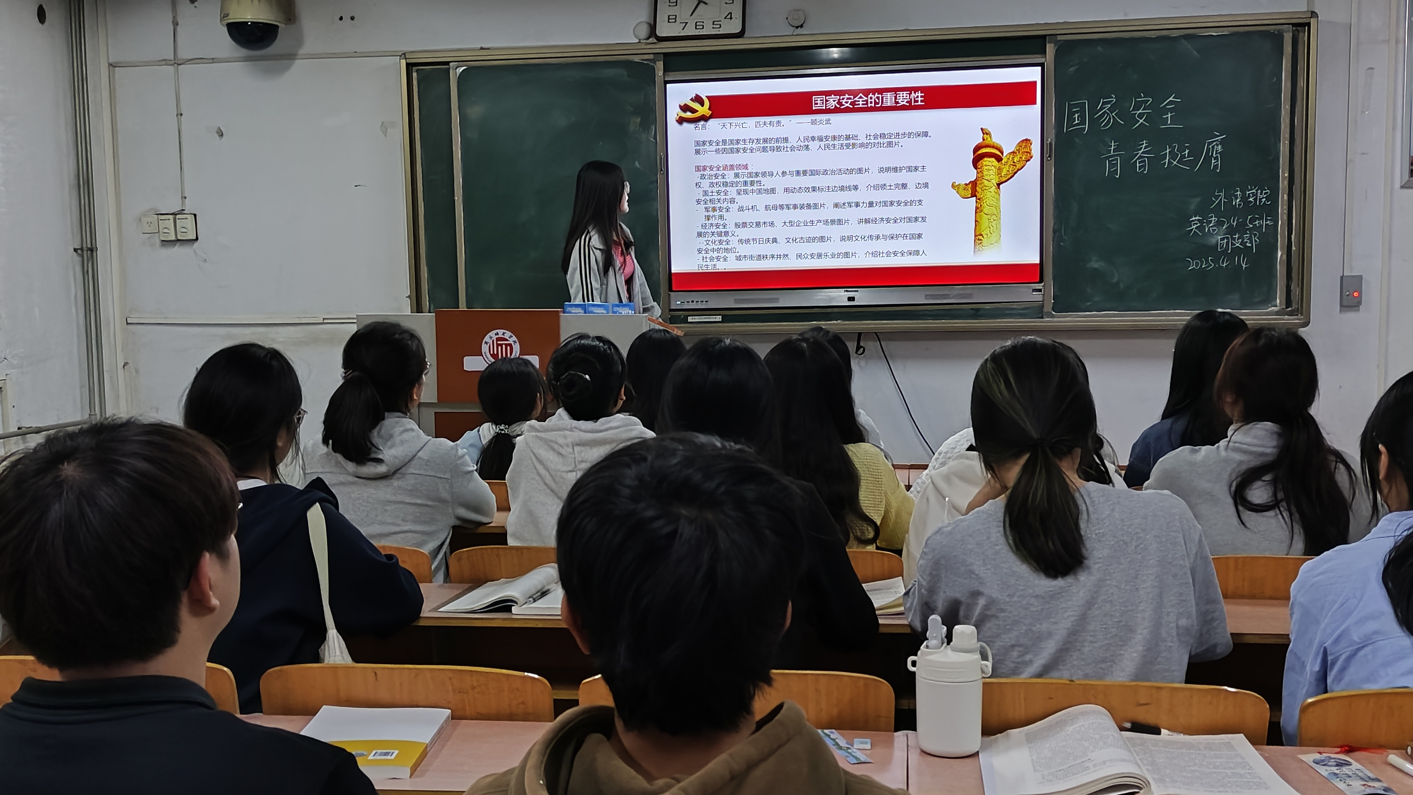 活动期间,各班团支部充分发挥主观能动性,紧密结合外语专业特色,开展了形式多样、精彩纷呈的学习交流活动。在知识竞赛环节,竞赛题目经过精心设计,巧妙地融合了国家安全相关的法律法规、古今中外的历史事件以及当下备受关注的时事热点。同学们全神贯注,紧盯题目,积极抢答,现场气氛紧张而热烈。在激烈角逐中,大家不仅巩固了国家安全知识,更深刻体会到国家安全与个人生活的紧密联系,认识到国家安全无小事,每一个人都是国家安全的守护者。