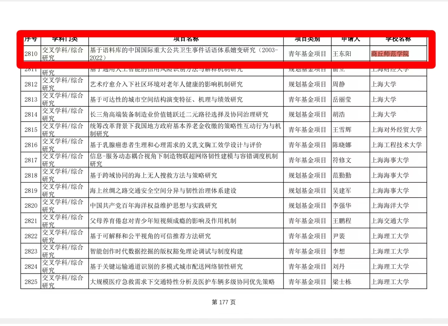 近日,2023年度教育部人文社会科学研究项目立项名单公示,公司科研秘书王东阳博士主持的《基于语料库的中国国际重大公共卫生事件话语体系嬗变研究(2003-2022)》成为全校唯一获批项目。该项目的获批是继杨静教授刚刚为E8官网登录入口取得国家社科基金历史性突破之后的又一喜讯,对E8官网登录入口的科研梯队建设、科研团队打造都具有重要意义。