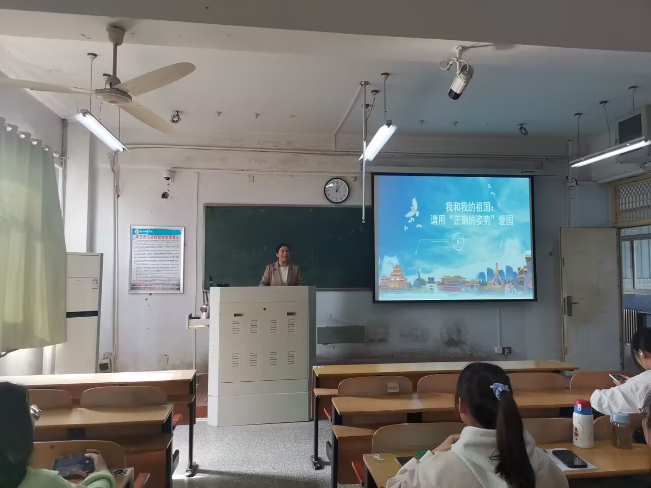 常素枝结合外语学科专业特点,围绕两个方面讲述自觉践行爱国主义精神的具体要求:一是坚持讲好中国故事,传播好中国声音;二是应该以怎样的正确方式和行动去体现爱国。常素枝通过讲解英雄人物的感人事迹进行多视角的爱国主义教育,并以“一个人的民族自豪感从何而来”的问题进行结尾,引发同学的思考。