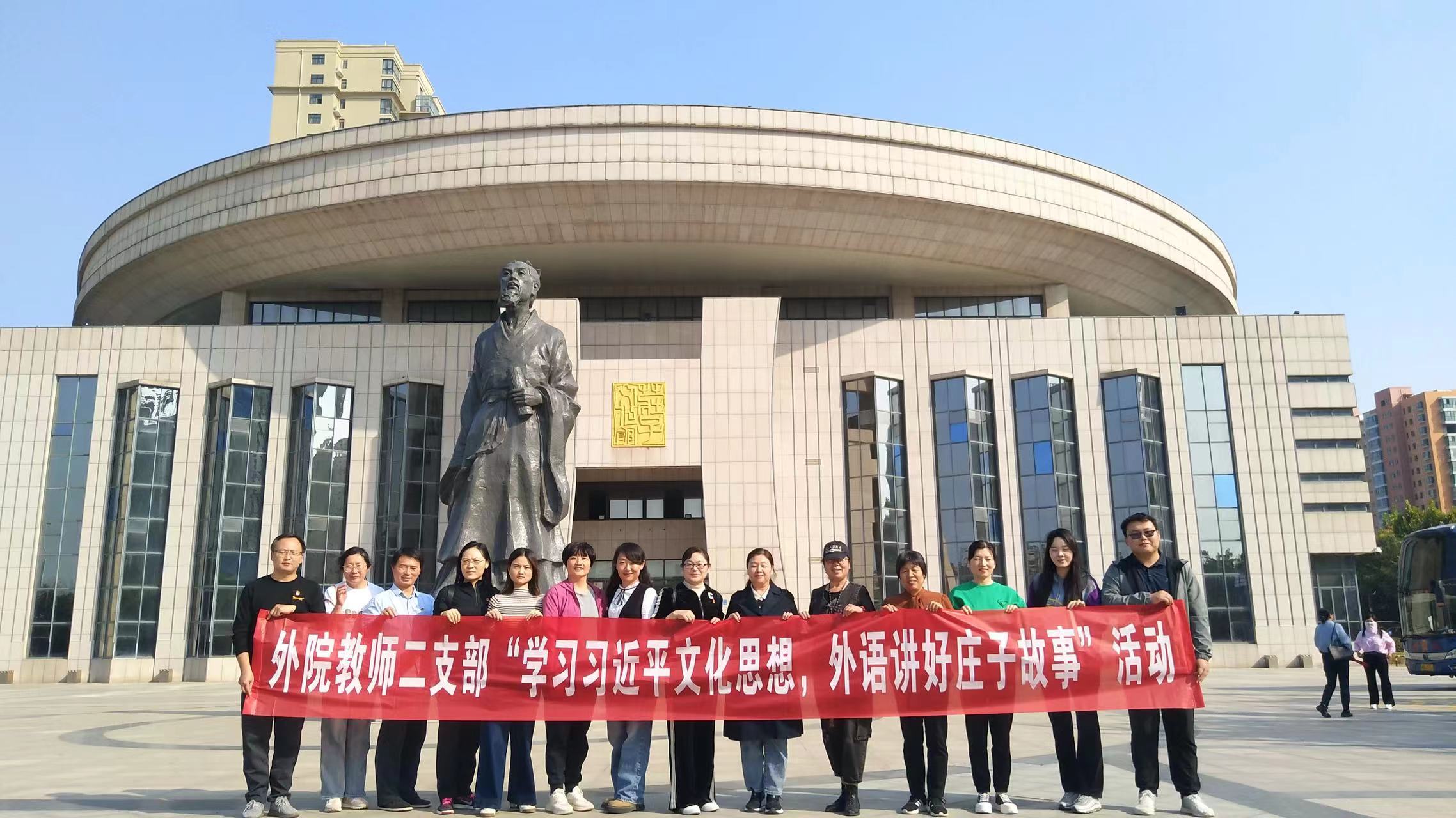 随后,大家还共同参观了民权庄子文化馆,实地感受庄子思想和庄子文化,沉浸式地了解庄子生平事迹、文化故事、轶事典故等,充分感受古圣先贤的思想内涵与人文精神。中华优秀传统文化是中华民族的文化根脉,不仅是我们中国人思想和精神的内核,对解决人类问题也有重要价值。通过本次参访活动,使大家更加深刻认识到弘扬中华优秀传统文化的重要性,纷纷表示一定用外语向世界讲好庄子故事、讲好中国传统文化。