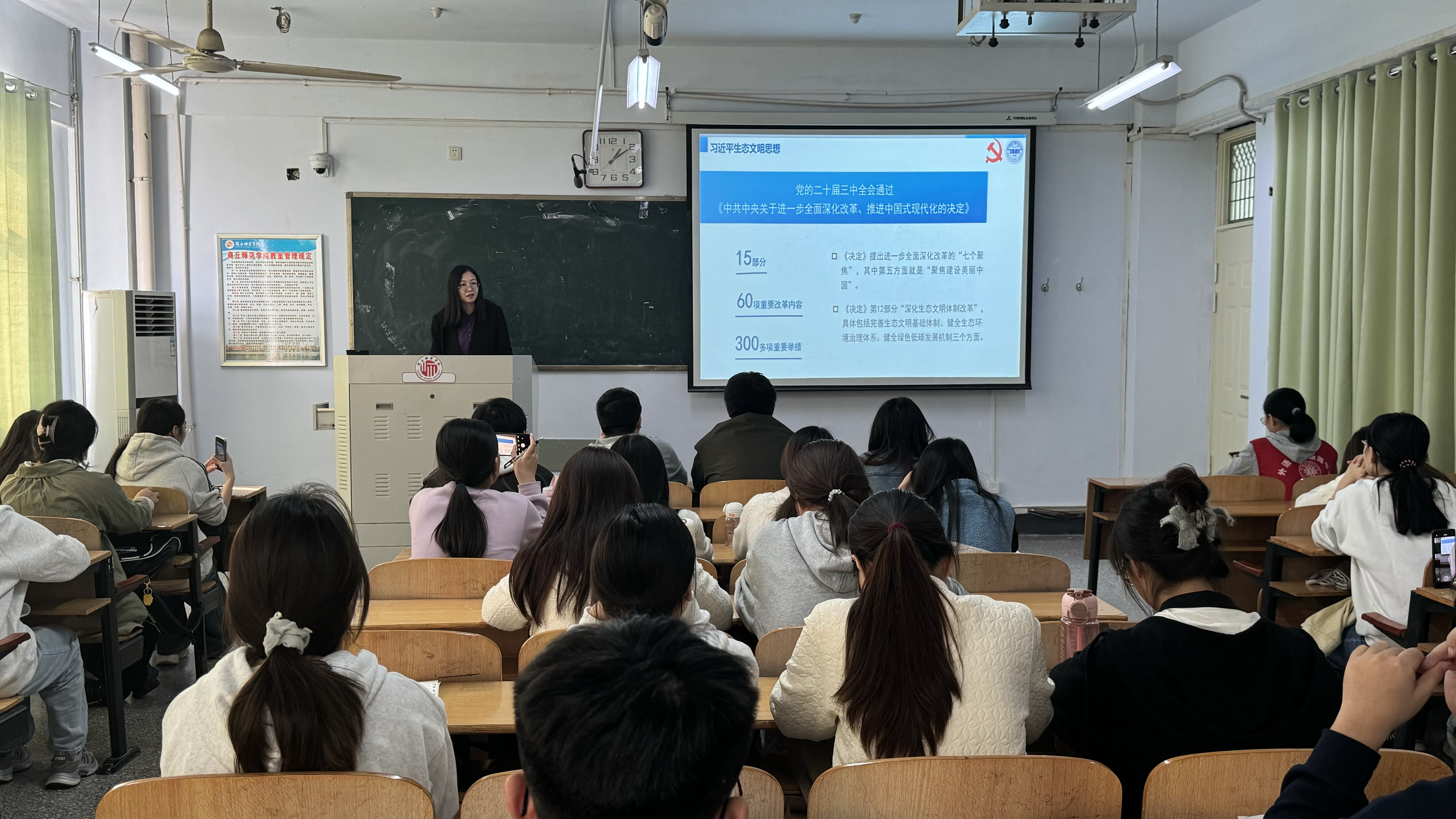 王頔从“习近平生态文明思想”“人类文明的演变与中国选择”“生态文明的内涵”“全面推进美丽中国建设”四个方面进行讲解。着重强调站在人与自然和谐共生的高度谋划发展,让高质量发展和高水平保护相辅相成、相得益彰,是习近平总书记从我国国情和实际出发作出的战略抉择。党的十八大以来,在习近平生态文明思想指引下,我国生态环境保护发生历史性、转折性、全局性变化,生态文明建设取得举世瞩目的成就。并对守牢美丽中国建设安全底线、开展美丽中国建设全民行动的意义和内容进行了阐述,建设美丽家园是人类的共同梦想,呼吁大家增强生态保护意识,践行生态文明理念。