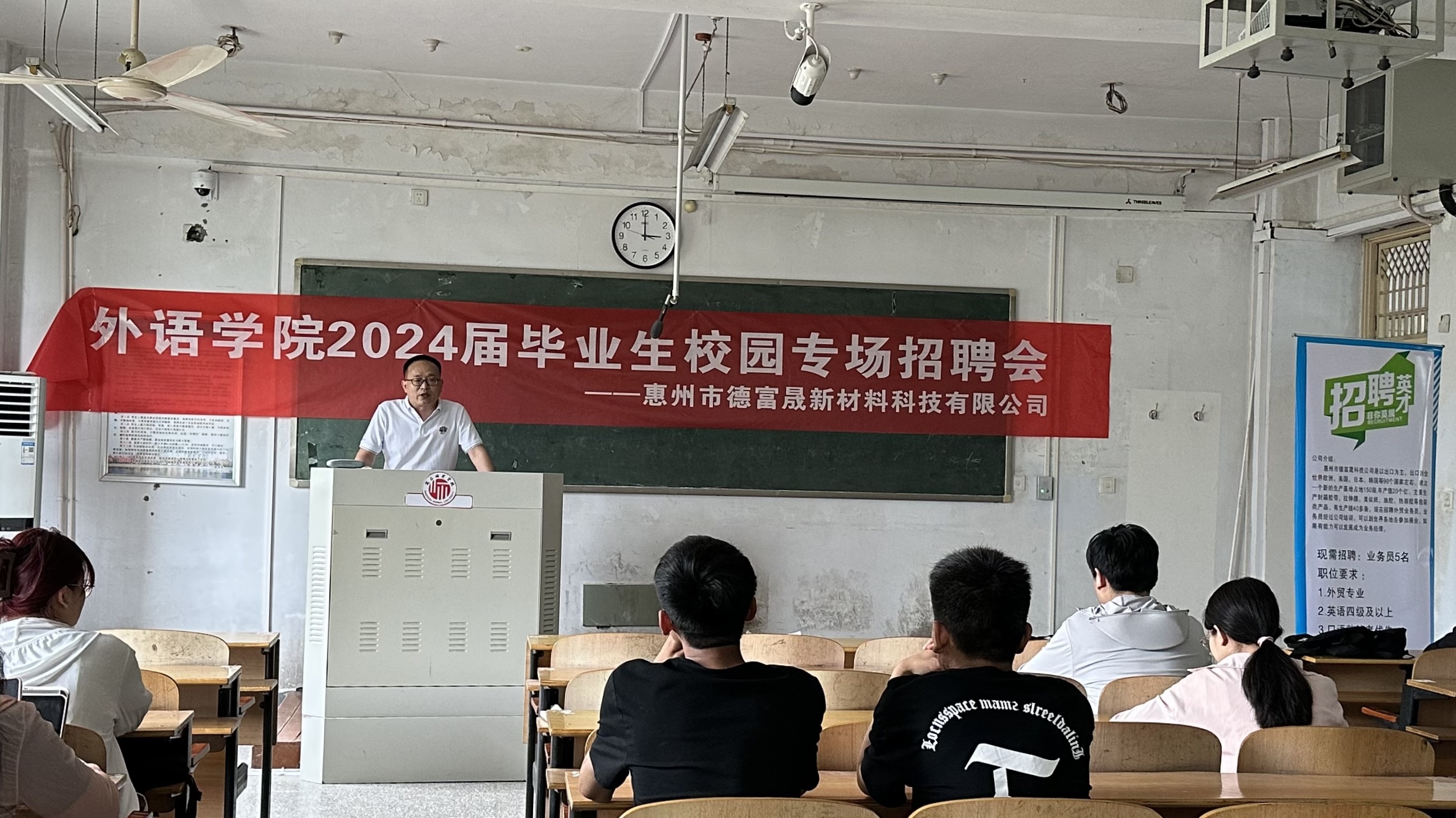 为进一步帮助“宏志助航计划”2024届毕业生和未就业毕业生顺利就业、尽早就业。5月30日下午,E8官网登录入口在智圆楼215教室举办了2024届毕业生校园专场招聘会——惠州市德富晟新材料科技有限公司专场招聘。E8官网登录入口科级组织员王贺乾、辅导员丁佳硕和部分2024届毕业生参加了招聘会。