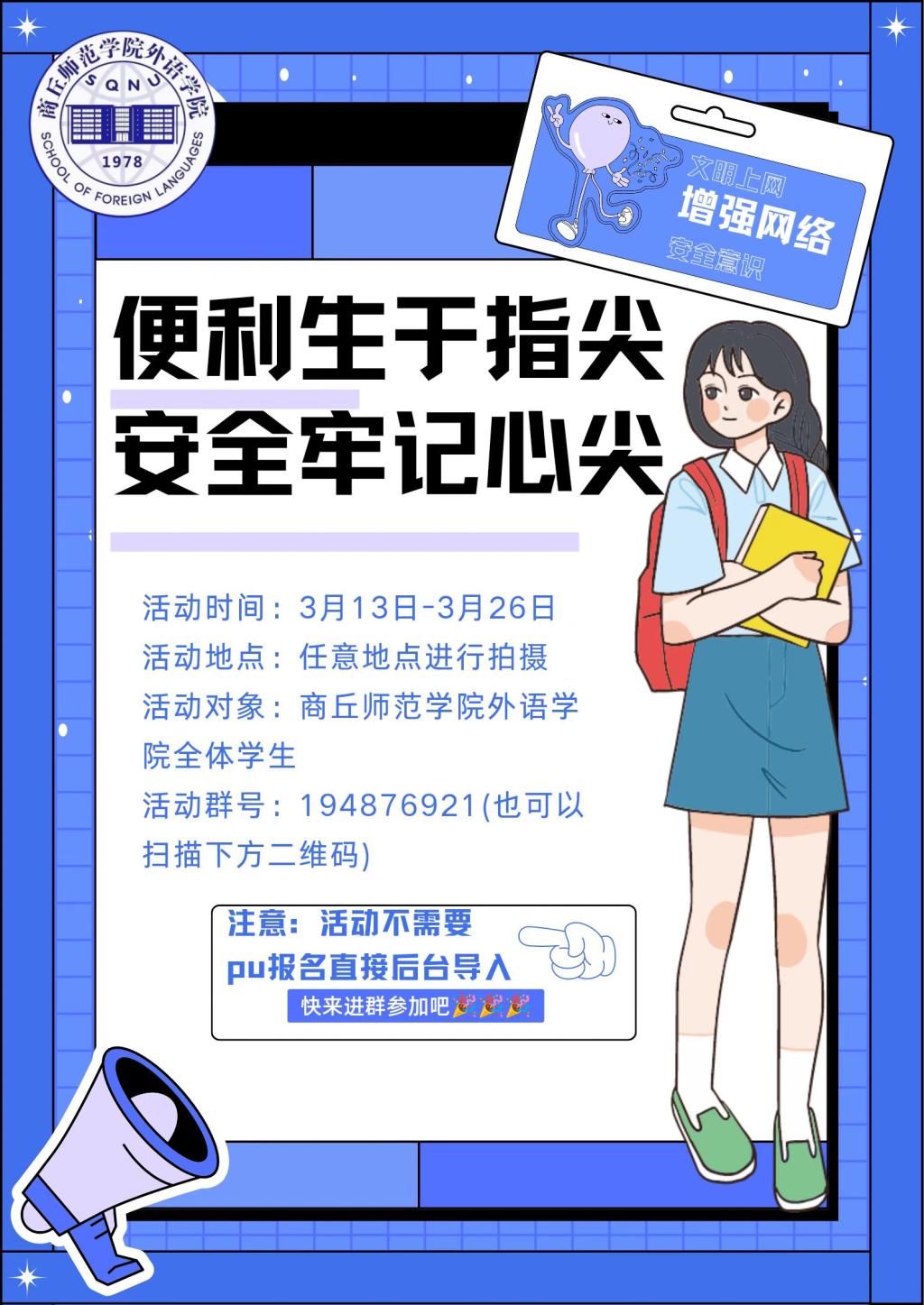 网络是亿万网民共同的精神家园,为使广大青年员工更加深刻了解网络安全和依法上网的重要性,做到文明上网,理性发言,E8官网登录入口于3月13日至26日面向全院员工开展了“便利生于指尖,安全牢记心间”文明上网短视频征集活动。
