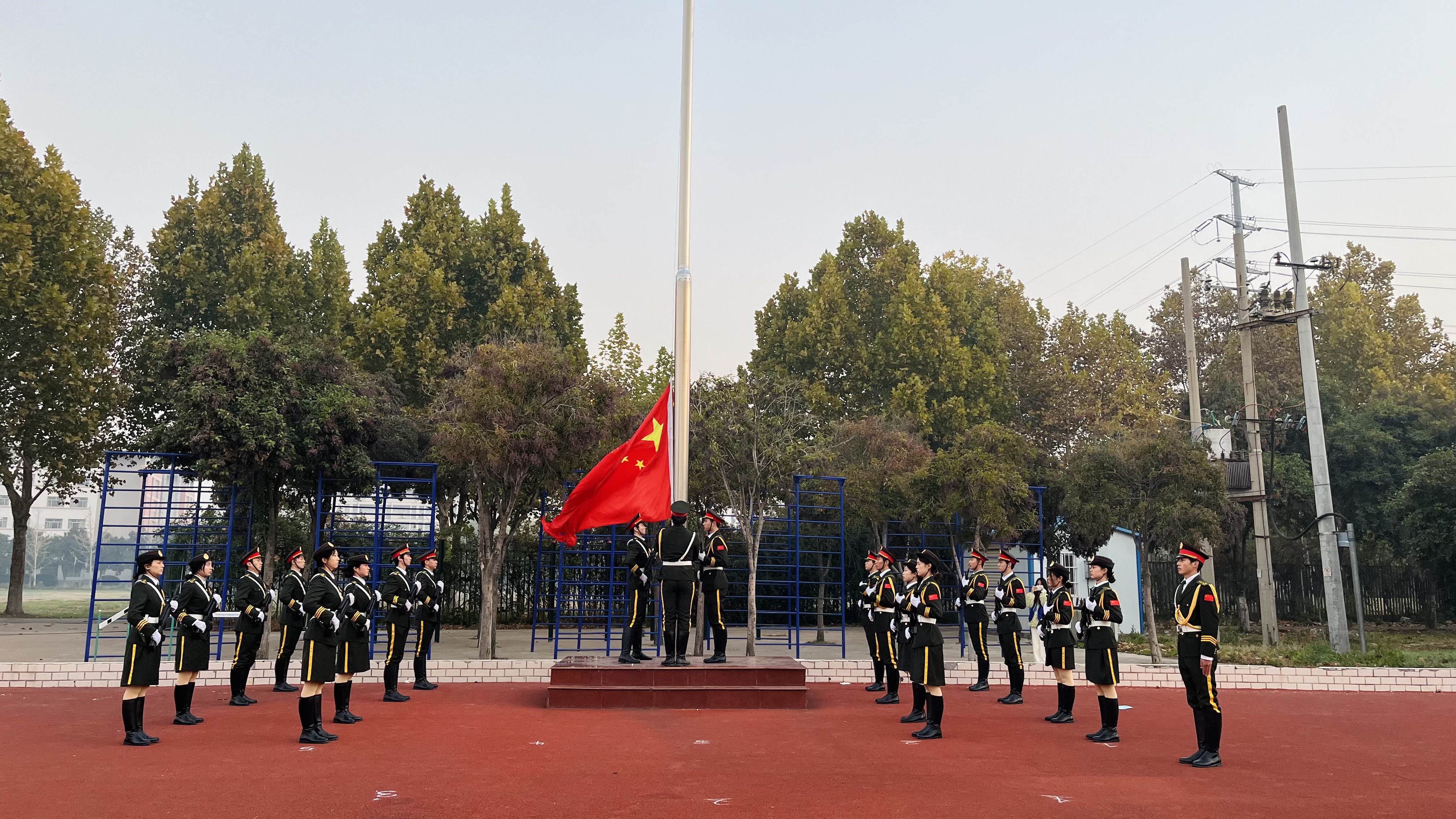 校国旗护卫队队员身姿挺拔,迈着整齐划一的步伐,护送国旗至升旗台前。伴随着雄壮的《义勇军进行曲》,鲜艳的五星红旗冉冉升起,全体师生行注目礼、唱国歌,脸庞上洋溢着庄重而自豪的神情。
