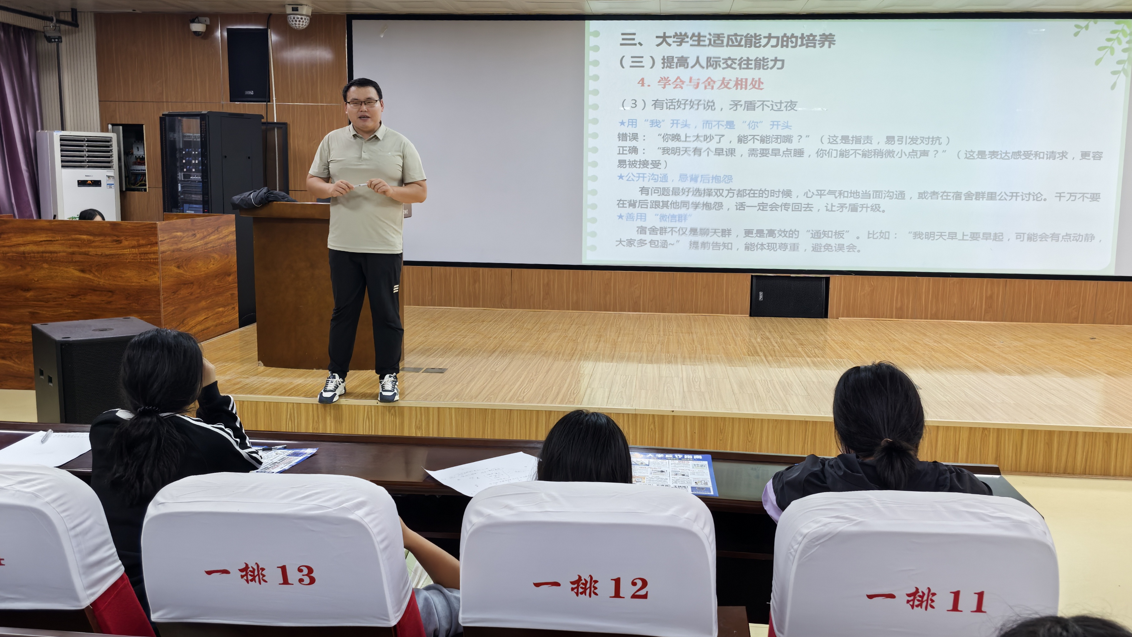 讲座围绕老员工面临的新变化、常见适应问题、适应能力培养以及校园资源与求助途径展开。郭继鹏指出,新生常见的适应问题广泛存在于生活、学习、人际和情绪等多个方面。比如情绪上,可能出现波动大、压抑、应对挫折能力不足等状况,甚至有极端行为风险。针对这些问题,他给出了实用的解决办法。生活中,要做好事务、经济和时间管理;学习上,培养良好心态与习惯,合理制定并执行学习目标;人际交往方面,树立健康人际观,掌握沟通技巧,主动构建积极的关系网络,尤其要学会与舍友和谐相处;情绪调节上,可运用生理调节、写情绪日记、合理宣泄和认知调节等方法。最后,郭继鹏介绍了公司老员工心理健康教育中心的资源与求助途径,鼓励新生在心理不适时,通过自助、向他人求助或寻求专业帮助等方式解决问题。