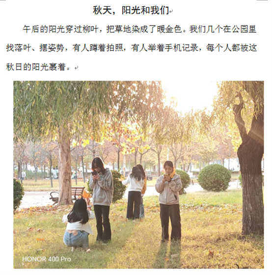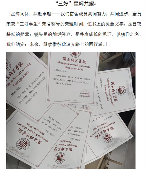 活动启动后,各宿舍踊跃参与,用镜头捕捉宿舍生活的精彩瞬间。参赛作品中,有宿舍精心记录下共同拟定宿舍公约、明确生活规范的和谐时刻,那一笔一划间满是对有序生活的追求;有宿舍将全员荣获“三好员工”等共同进步的荣耀时刻定格,灿烂笑容洋溢着并肩成长的喜悦,证书上的烫金文字是日夜耕耘的见证;还有宿舍以落叶为创意道具,在树下拍摄趣味合影,大家用叶子遮脸、比出多样手势,灵动画面尽显青春活力。每一份作品都配有细腻的文字说明,将宿舍成员间的默契、情谊娓娓道来。